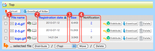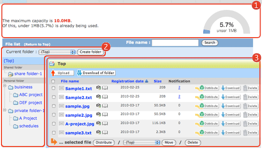In the area of the system, you can operate like as follows: see the list of files, distribute files, upload files, download files, delete files, create folders, edit folders, delete folders, move files into another folder, see the details of files, change file’s name and so on.